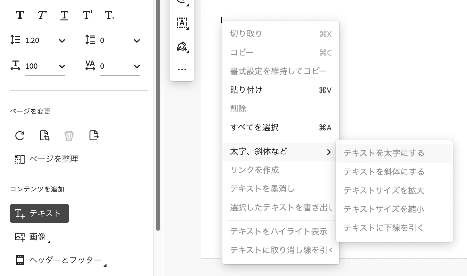 なお、現在、「編集」→「テキスト」→右クリックを押した際の表示は以下になります。