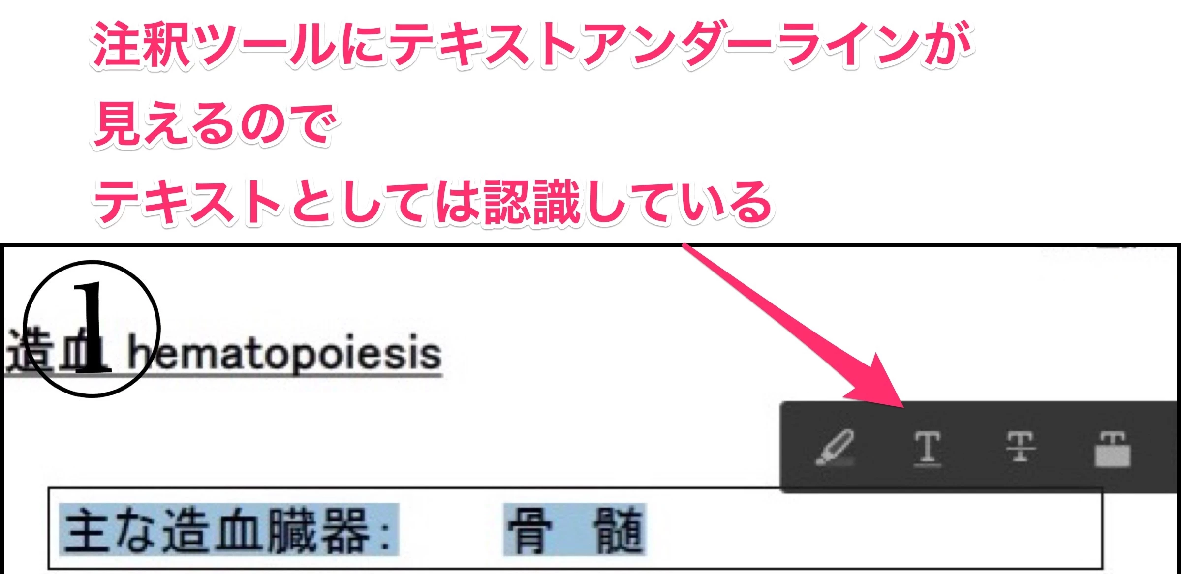 テキストデータがないからかとも思ったのですが、テキストの選択はできる状態です。(写真①)