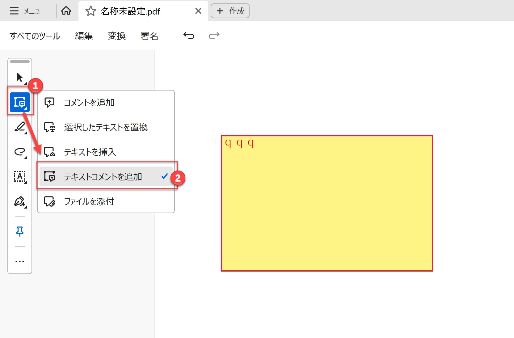 Acrobatの新UIの「テキストボックス」機能についてですが、次の画面のように、ツールバーの「コメントを追加❶」の中に「テキストコメントを追加❷」として隠れているようです。