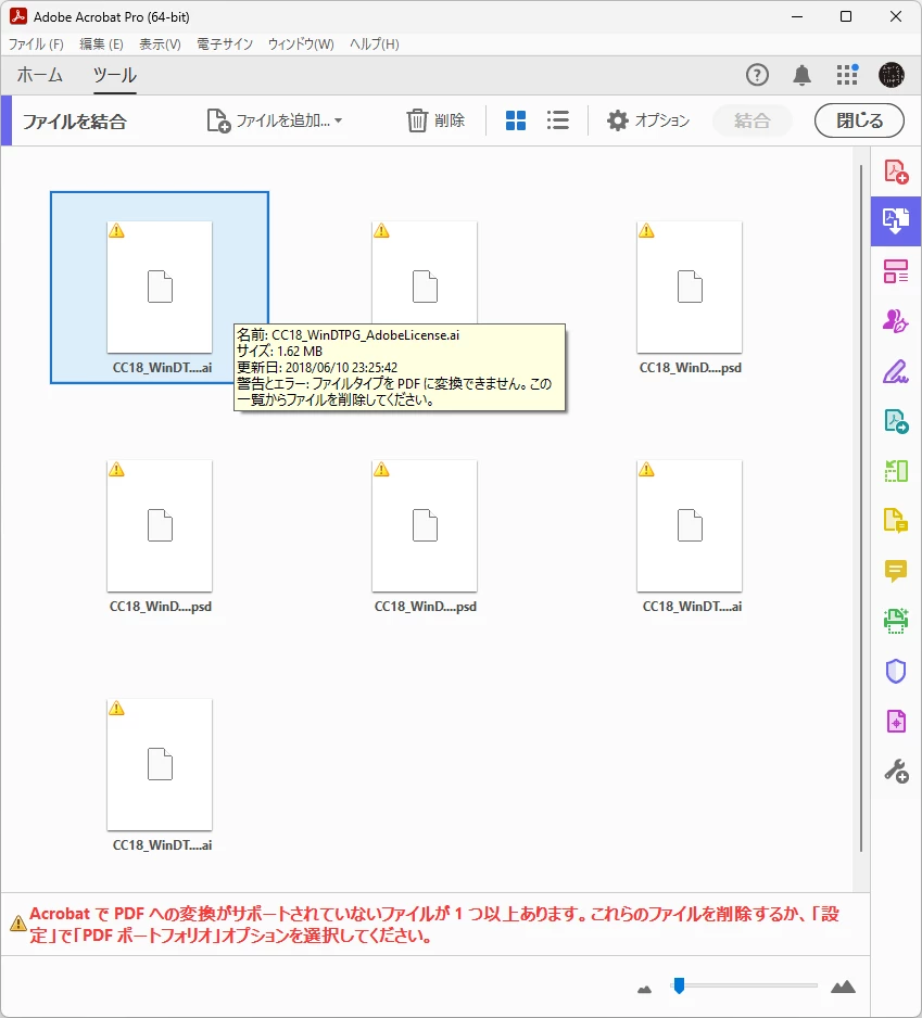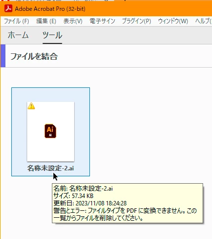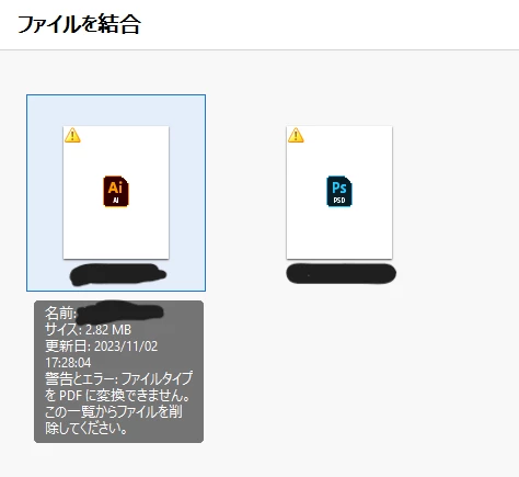 BBccilParticipantForum|Forum|2 years agoNovember 8, 2023Questionファイル結合をする際、psdとaiがPDFに変換できなくなってしまったForum|Forum|2 years agoNovember 8, 20236 replies1109 views1度Illustratorをアンインストールしその後誤って拡張子を別のプログラムで開いてしまい、その後元に戻したのですが、それ以来Acrobatでai形式のファイルをファイル結合しようとすると、画像のような画面になり結合できなくなってしまいました。PhotoshopもIllustrator同様、アンインストールしましたがこちらは拡張子などはいじっておりません。1度全てアンインストール、ファイルなども削除しインストールし直しましたが、一向に解決できず困っております。何卒よろしくお願い致します。PDF の編集と変換