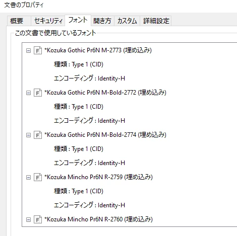 フォントを確認すると以下の「*Kozuka~」が埋め込まれています。