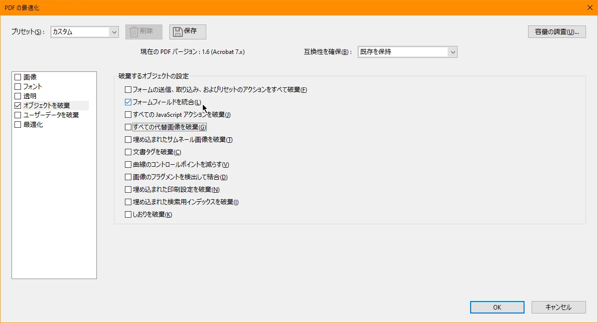 プリフライトのフィックスアップか,PDFの最適化から行うでしょうか。