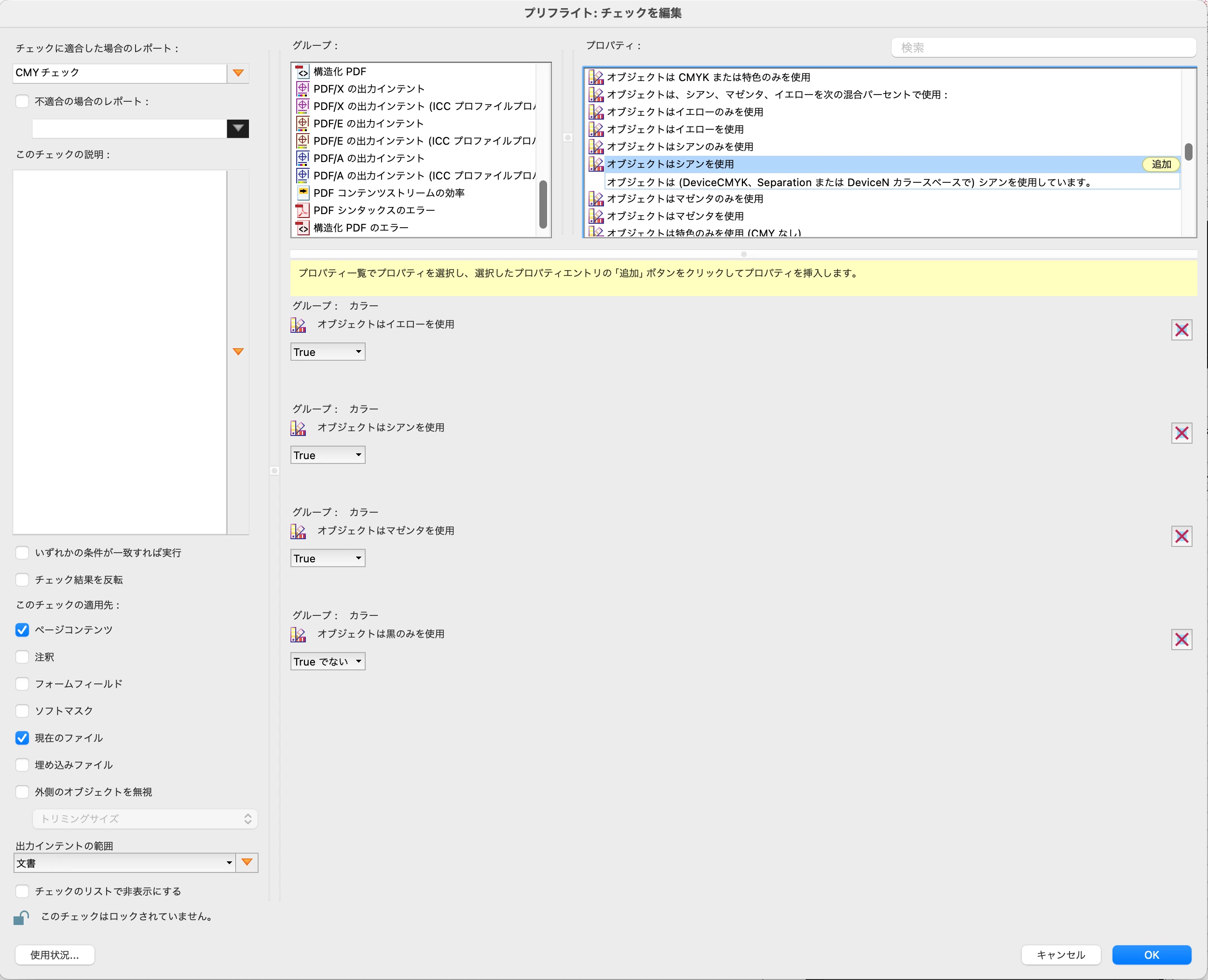 具体的には、CMYKのうちCMYのカラーを使用したオブジェクトが一つも存在しない場合、エラーとなるようにプリフライトチェックのプロファイルを作成したいです。
