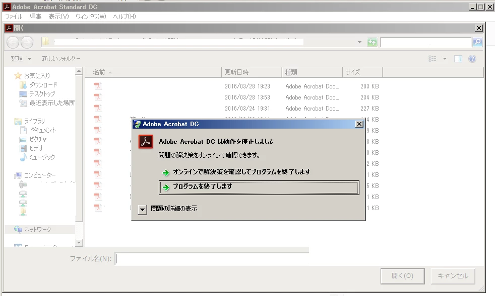 メニューのファイルを開く/保存を選択してWindowsのエクスプローラが開くとAcrobat Standard DCが動作を停止する。