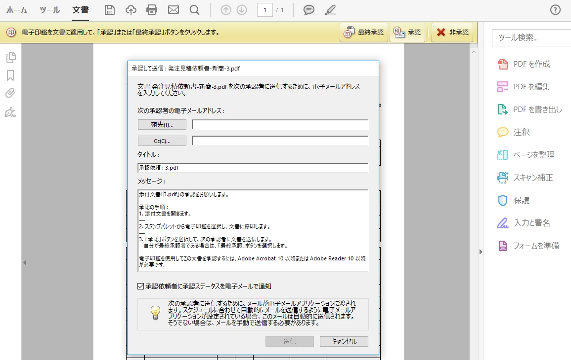 Acrobat pro DCを使って承認文書をメールで送信するとき、上図の画面で[宛先]をクリックしてもアドレス一覧が表示されません。