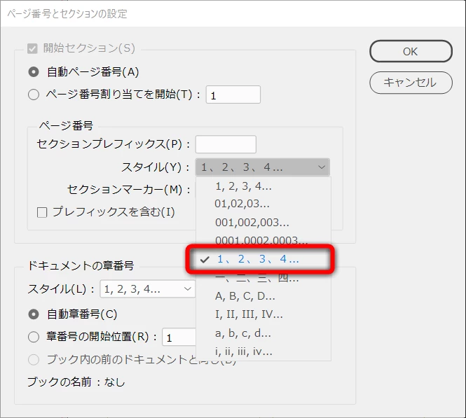 ページパネルメニューの「ページ番号とセクションの設定で、次の図の囲ったものを指定します。