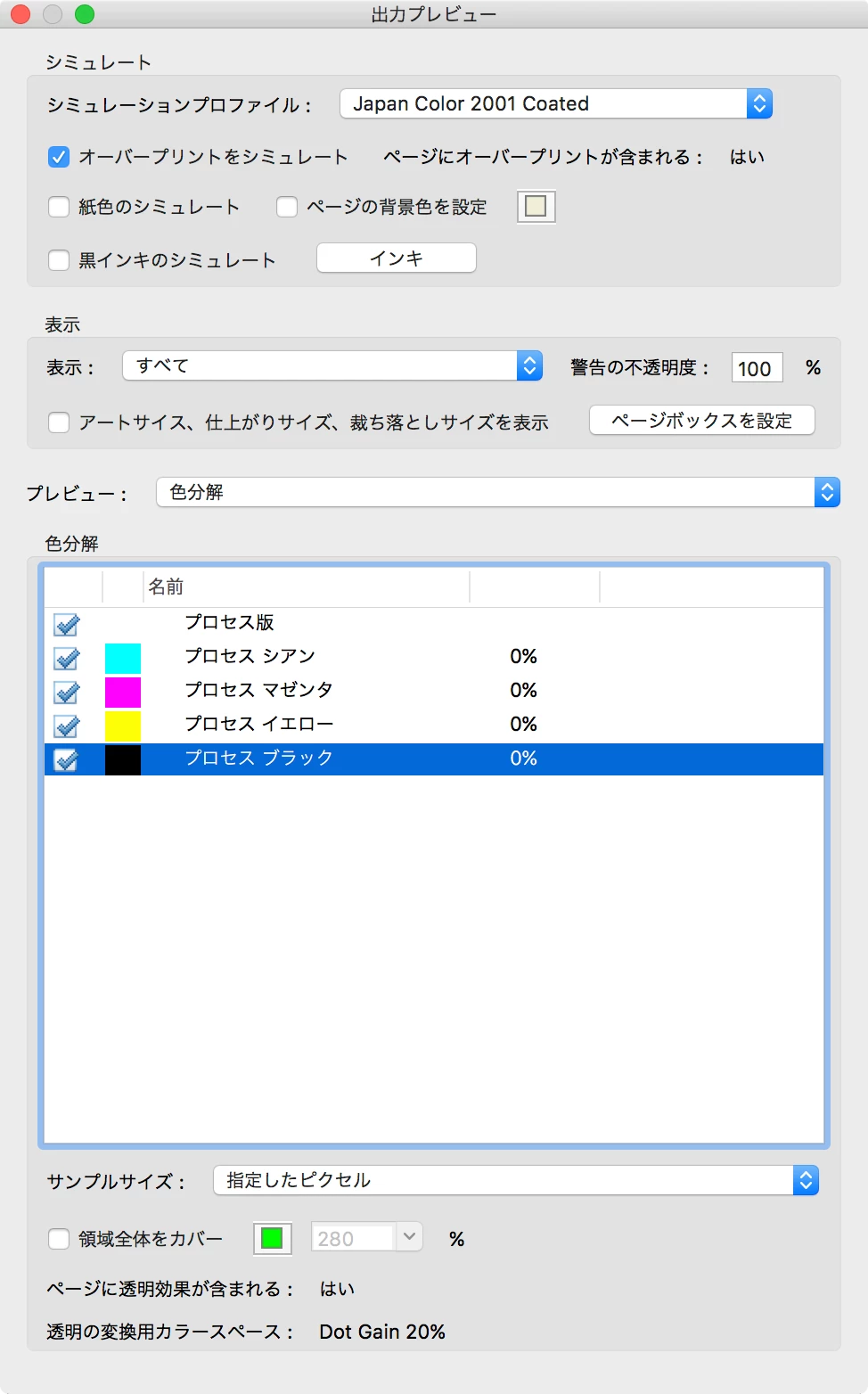 ちなみに埋め込んだほうのPDFをInDesignに配置して分版プレビューをするとK版のみで表示されます。