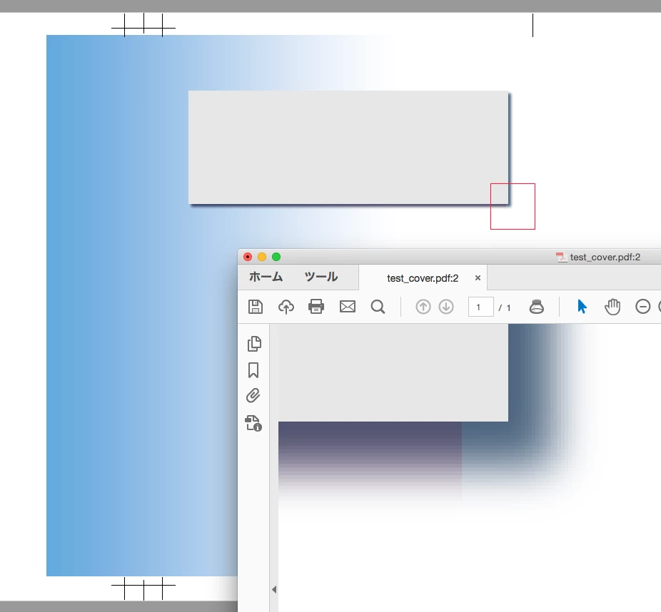 書き出したPDFをAcrobat DCで開いて 見ると、PSD画像にかかる部分のシャドウと、そうではない部分のシャドウとでくっきりと色が変わります。