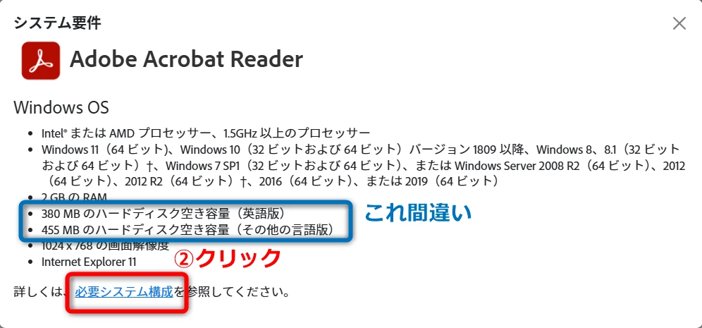 十分な容量があるが、容量不足と表示されてAdobe Acrobat Readerをインストールできない