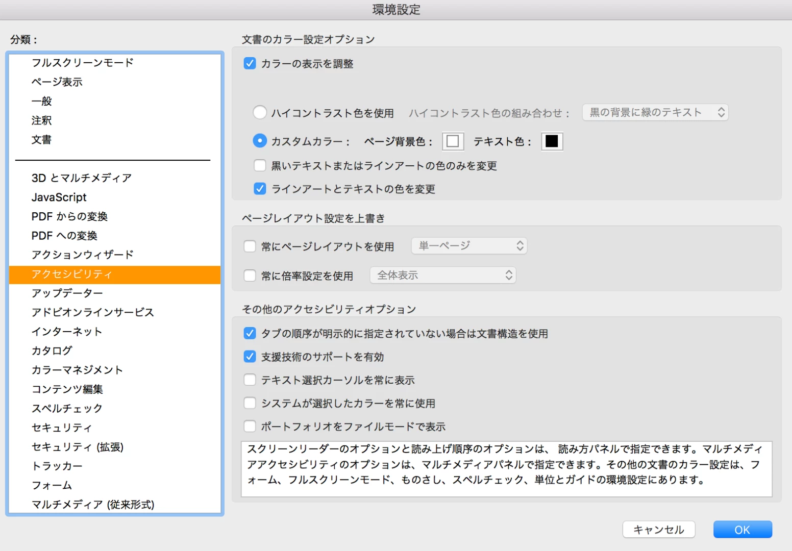 色覚の問題で,いつもはAdobe Acrobat Pro DC の「環境設定」の「アクセシビリティ」の「文書のカラー設定オプション」にある