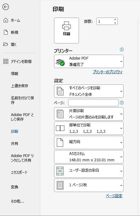 マイクロソフトWord(Microsoft® Word for Microsoft 365 MSO (バージョン 2501 ビルド 16.0.18429.20114) 64 ビット)から印刷でPDFを作成しようとしましたが、プリンタ設定でA5サイズをしていしているのに縦210で横がA5の倍というサイズで印刷されてしまいます。このことで非常に困っております。