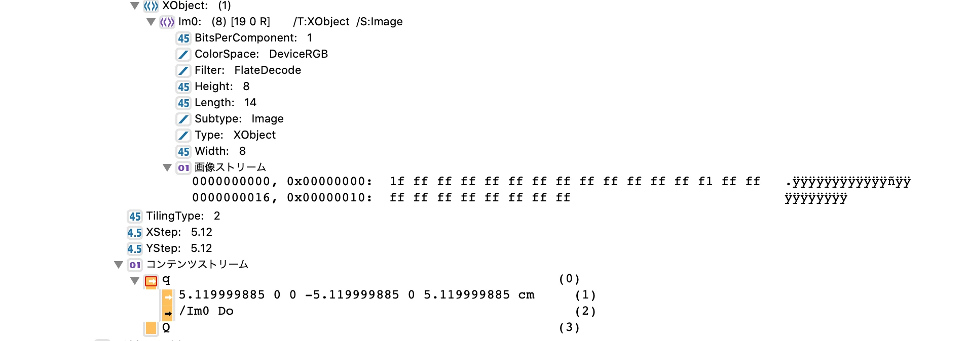 この様にPDF上ではDeviceRGBで画像ストリームが埋め込まれた状態のパターンとなります。これ、とても扱いにくいです。手っ取り早いのはIllustratorでラスタライズしてしまうことではないかと思います。