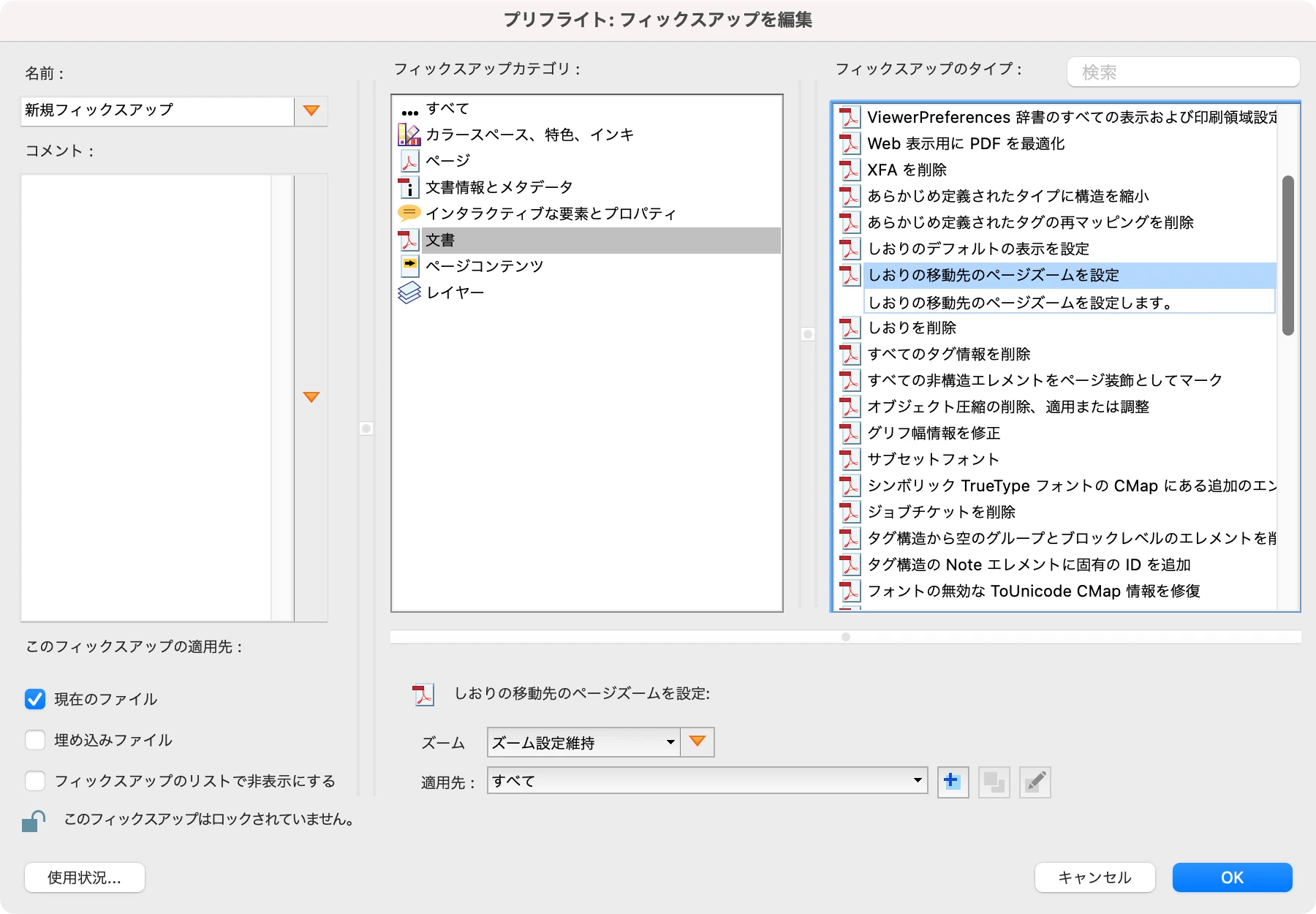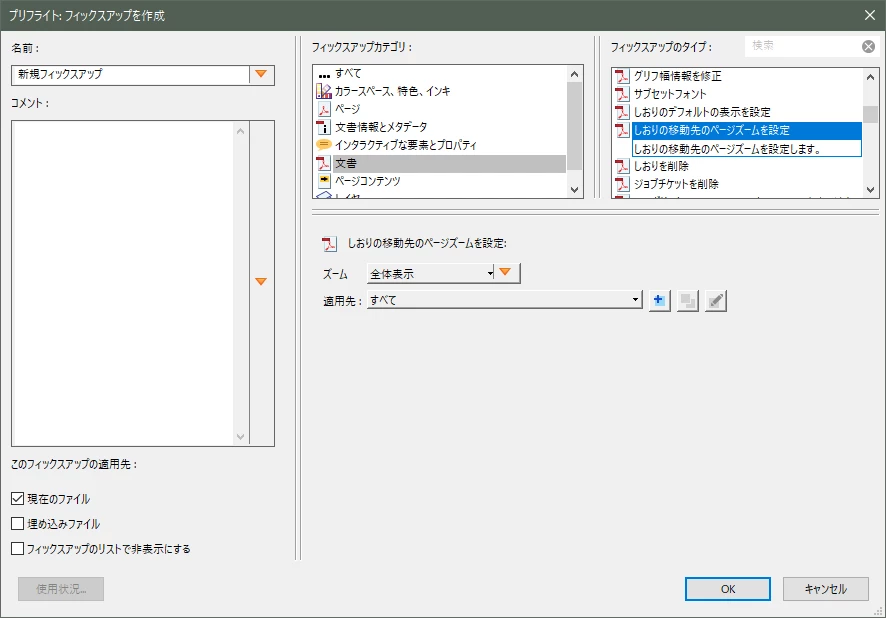 しおりが100個以上あるPDFファイルについて、現状だと手作業で一つずつ「全体表示」から「ズーム設定維持」へと変える必要があります。あまりにも大変なので