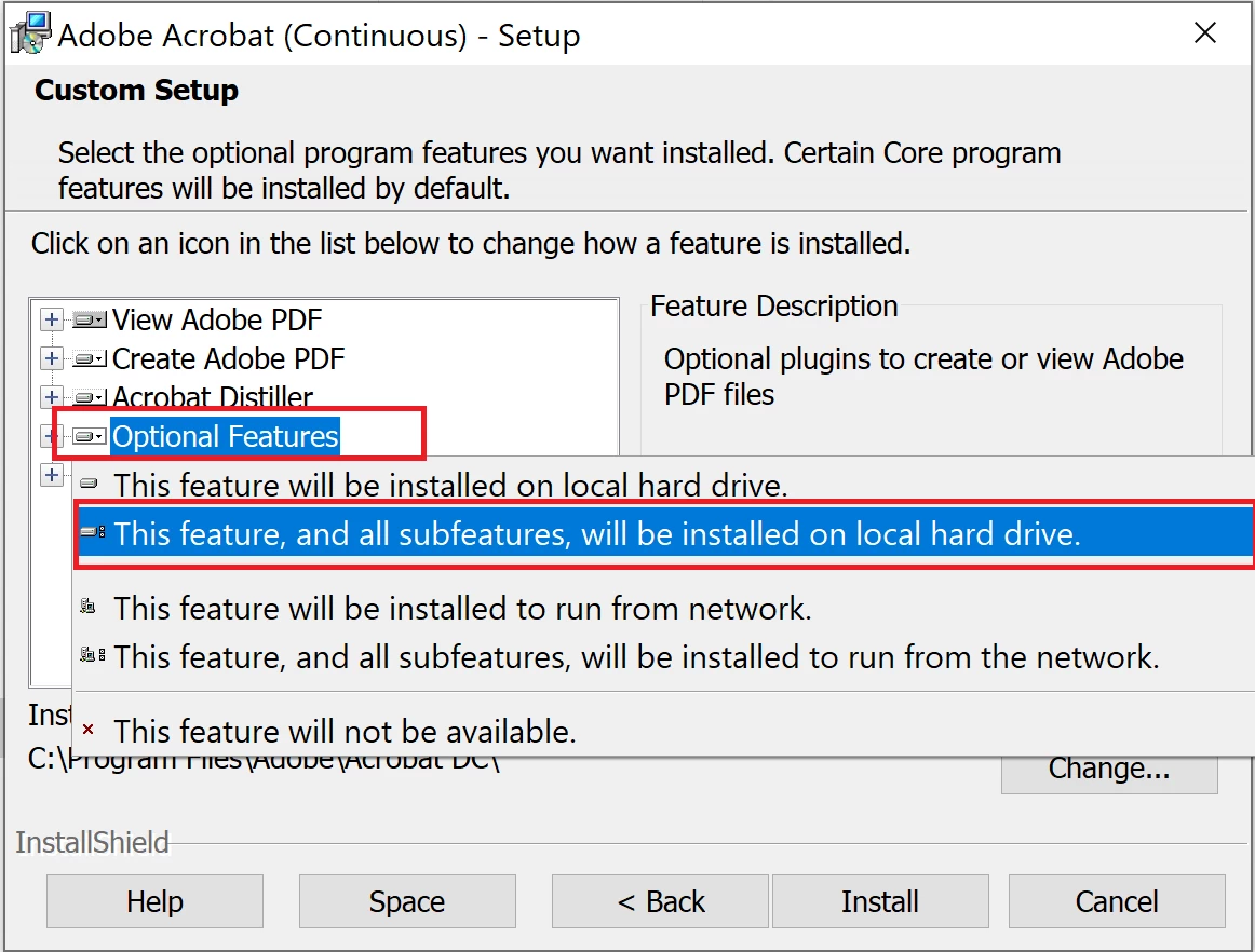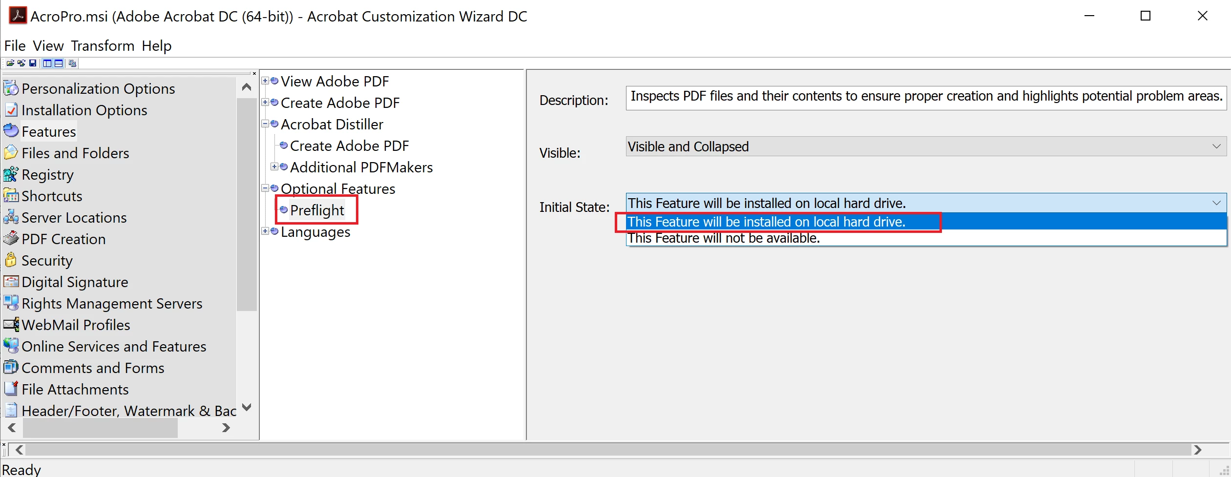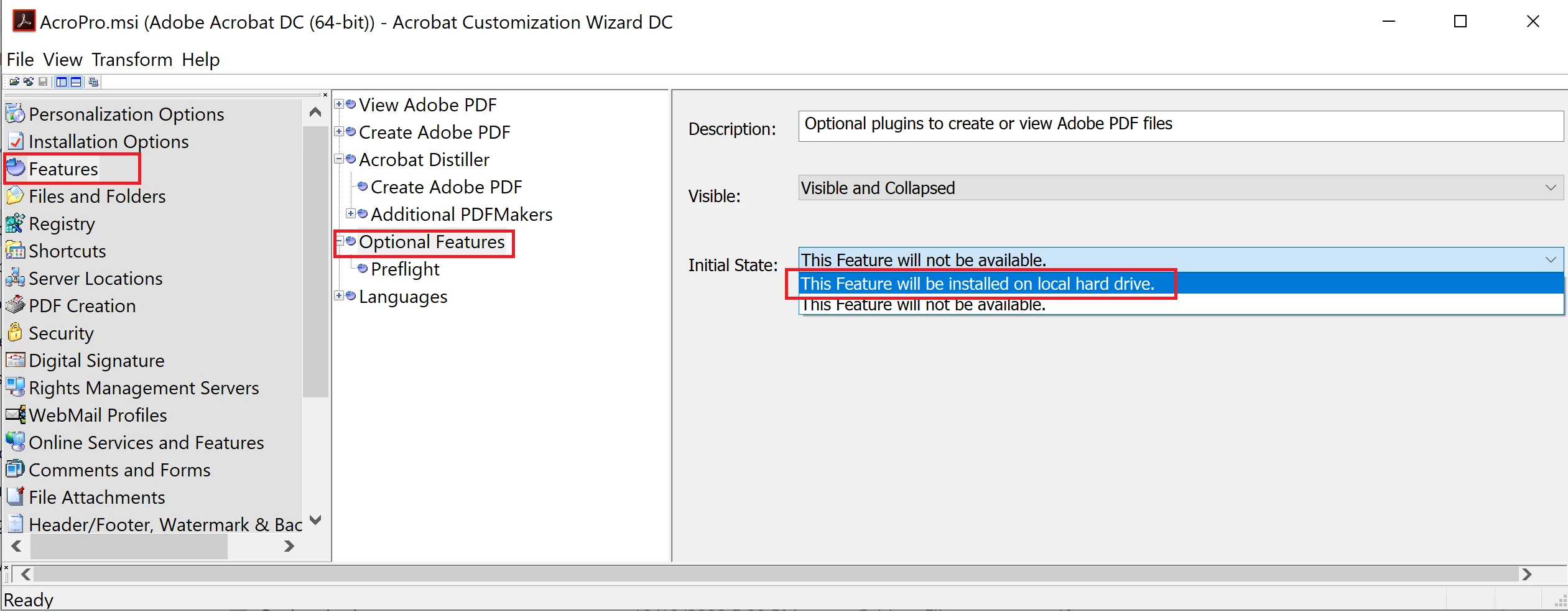 <インストーラパッケージ名>\Build\Setup\APRO22.0\Adobe Acrobat - Customization Wizard でインストーラを開いたら、Features の項目から Optional Features の Initial State を変更します。