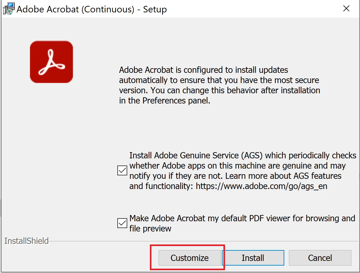 - Windows インストーラが起動して、Acrobat のセットアップ画面が表示されるので、Customize を選びます。