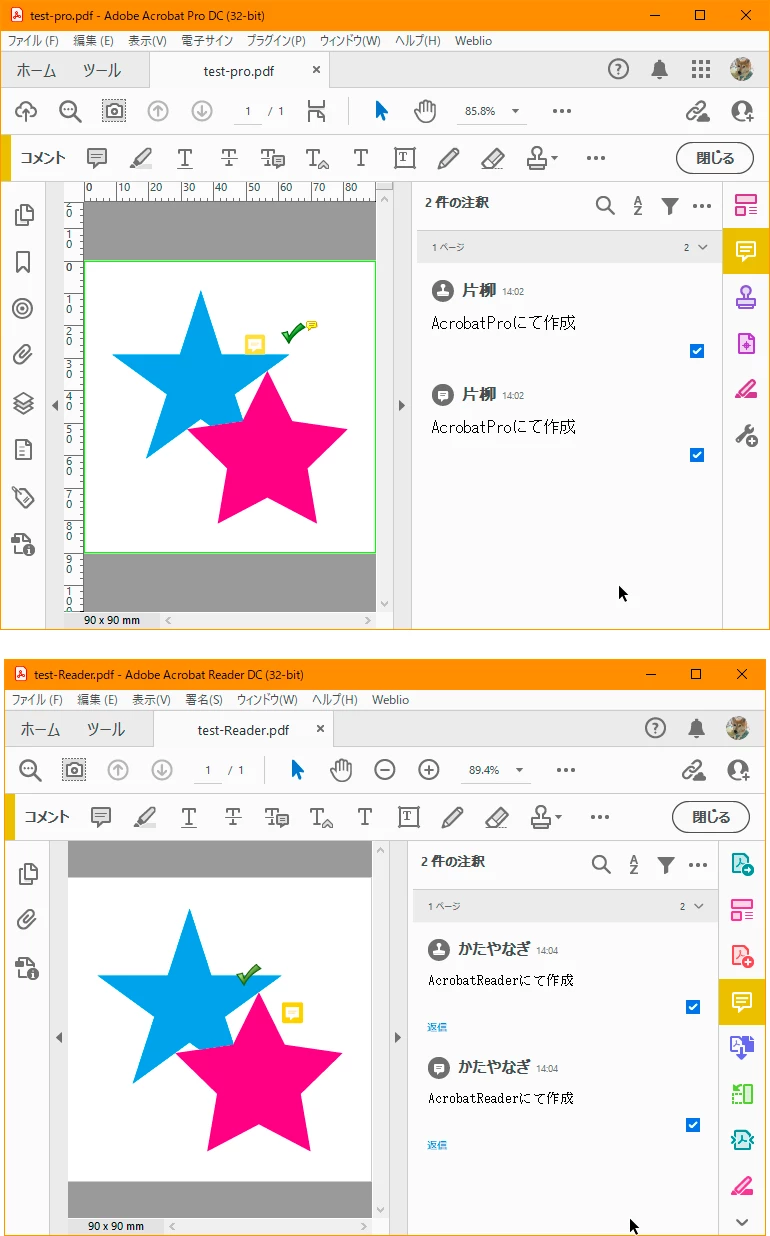 「test-pro.pdf」はProで注釈を作成しチェックを入れたもので,「test-Reader.pdf」はReaderで行ったものです。