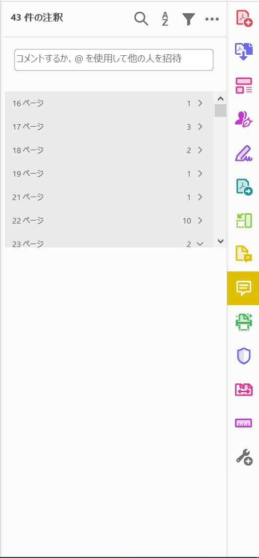 優優一兵44011523Participating FrequentlyForum|Forum|2 years agoOctober 18, 2023Question注釈の一覧パネルが小さく表示されるForum|Forum|2 years agoOctober 18, 20230 replies148 views画面右側に表示される注釈の一覧パネルが一部しか表示されず、コメントが隠れて見にくくなる。複数のモニターに接続している場合、表示させるモニターによって症状が発生したり、解消したりする。解決策をご存じであれば共有いただきたいです。 Acrobatバージョン:2023.03.20284OS:Windows 10 Enterprise、バージョン:21H2一般的なトラブルシューティング