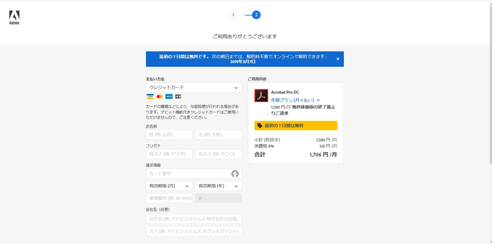 クレジットカード情報入力時、下の画面にある青い部分に無料体験期間の表示も出ます。