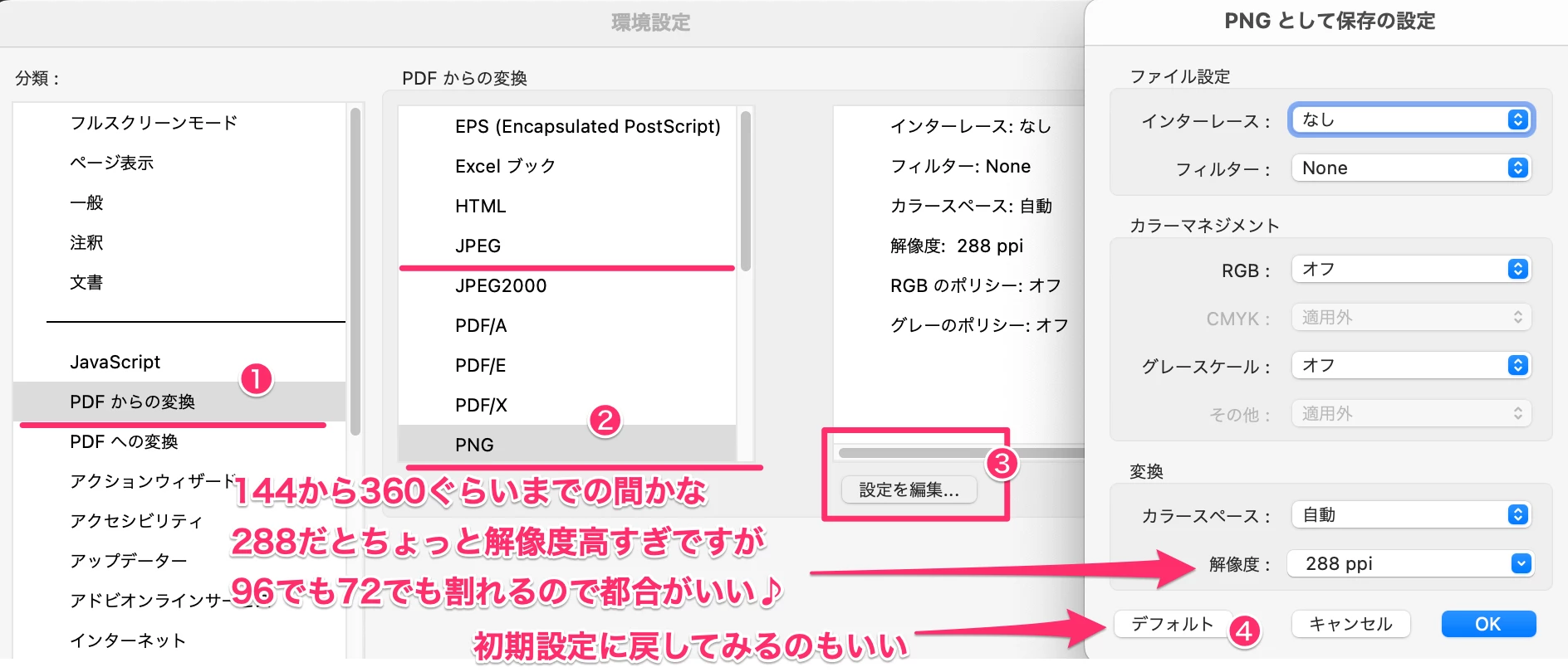 AcrobatのPDFから、画像(JPEG・PNG)へ書き出し際、アンチエイリアスがかからず、ギザギザ状態になってしまいます。