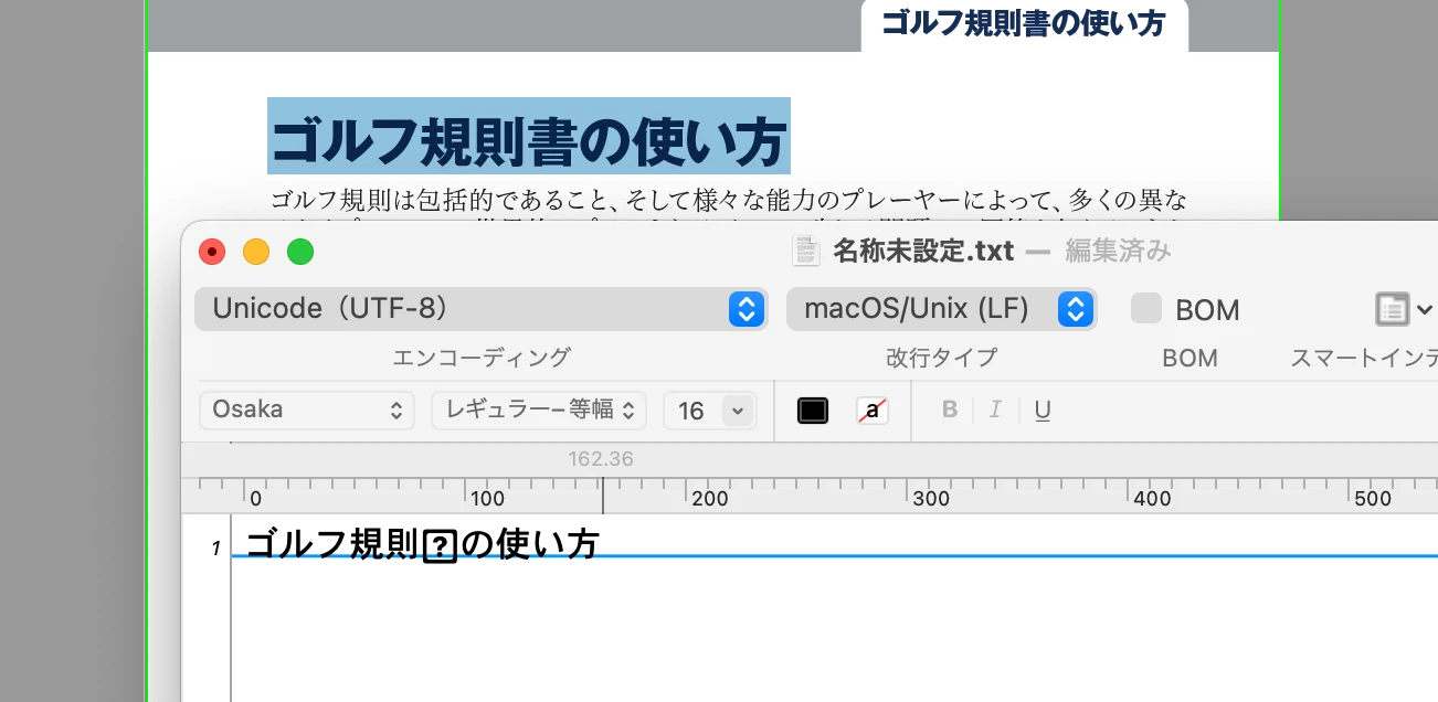 文字化けが確認され、先ほどとは異なり改行まで挿入されてしまっている。