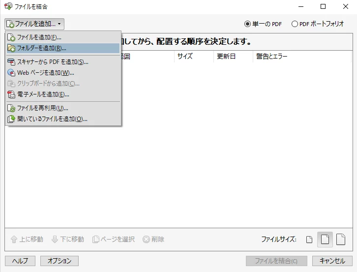 「ファイル」--> 「ファイルの作成」-->「ファイルを単一のPDFに結合」を押したときに出るダイアログで