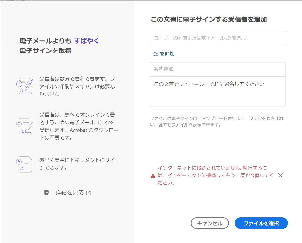 「この文書に電子サインする受信者を追加」セクションにてユーザーを選択した後にファイルを選択しようとするも、「インターネットに接続されていません。続行するには、インターネットに接続してもう一回やり直してください。」と表示されます。(添付参照願)