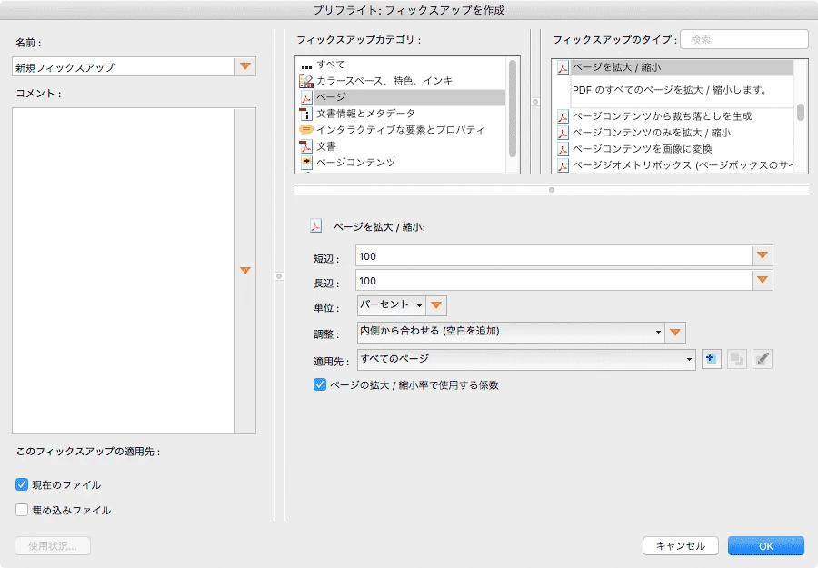 プリフライトパネルで新規プリフライトを作成し、フィックスアップを作成からページを拡大 / 縮小、という流れです。倍率を変数にすると良いでしょう。