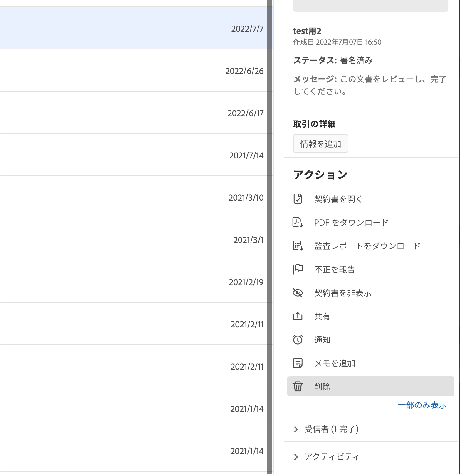 そのアカウントのサイン済みの書類/PDFファイルを削除したいと思っています。