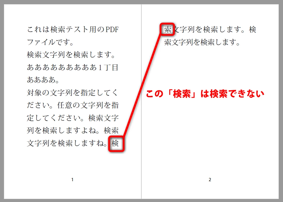 ほかにも、画像PDFからOCR機能を使用して透明な文字を作成した場合、その文字が誤認識されてしまっていると検索対象から外れますし、PDFを作成する過程で一部の文字が画像化されてしまうと、そこには文字が存在しないため検索対象となりません。