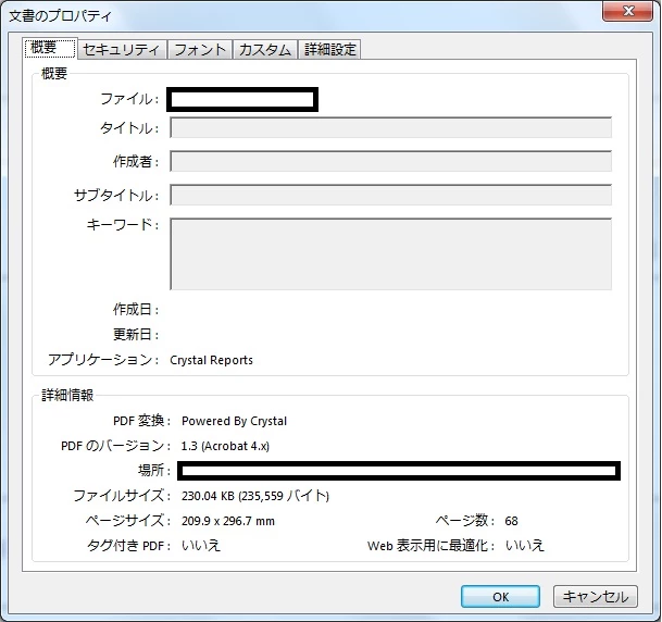 もう一つ、文書のプロパティの概要のタブで、アプリケーションとPDF変換のところがどうなっているか教えて頂けますか?(スクリーンショットでもかまいません。CrystalReportsでしたら、CrystalReports自身で直接PDFを生成している可能性が高いと思いますが、それが確認できます)