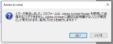 「はい」を押して続行した場合、配布用PDFフォームは生成されるのですが、Acrobat readerで開いた際にPDFフォームとして認識されず、「フォームの送信」ボタンが表示されません。(Acrobat standard 2017で開いた場合は「フォームの送信」ボタンは表示されます。)