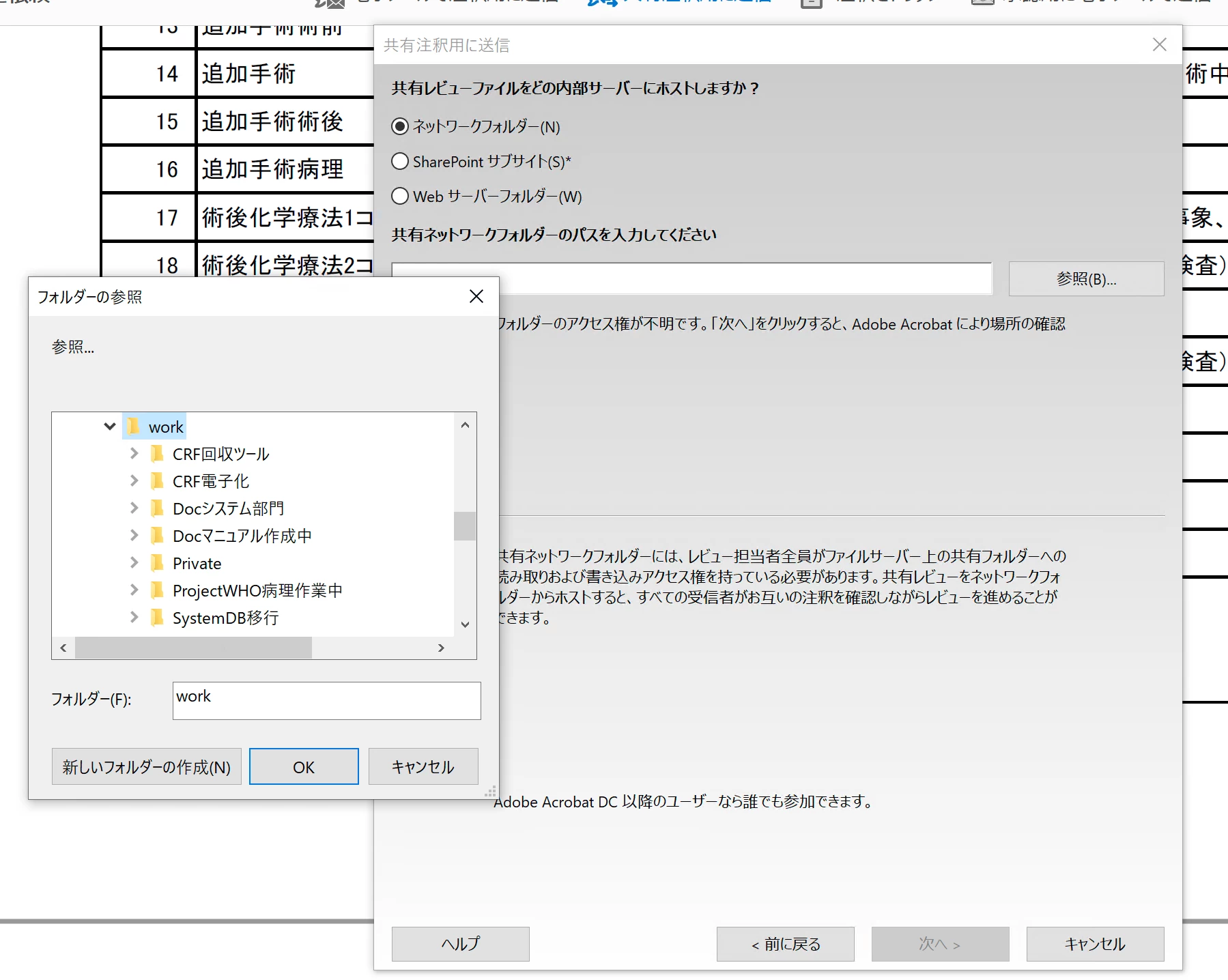 Acrobat Standard DC 共有注釈用に送信画面で、「ステータス:共有フォルダーを作成できません」 と表示される件