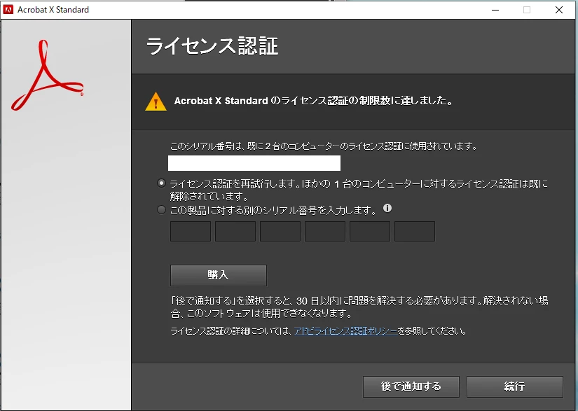 【Acrobat X Standard】ライセンス認証の制限値に到達しました