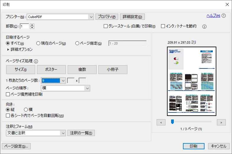 簡単に設定したスクリーンショットを用意しましたが、この中でいえば「複数」ボタンを押して、その直下にある各種設定を行うことで、1枚の中に複数ページを入れて印刷ができます。