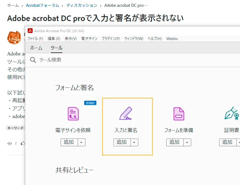 Adobe acrobat DC proで入力と署名が表示されない
