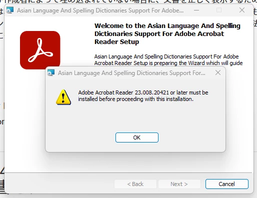 Acrobat 64bit 2025.001.20643に対して、フォントパックとスペルチェック辞書の2023.x/2022.x/2021.xいずれにおいても、仰るようにバージョン警告が出て進めない状態なのがわかりました。