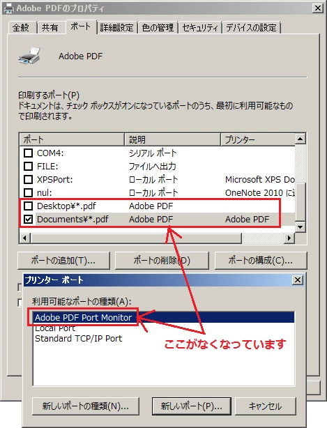 ・プリンタポートの手動作成(ポートの種類に「Adobe PDF Port Monitor」がないためエラーになりました)