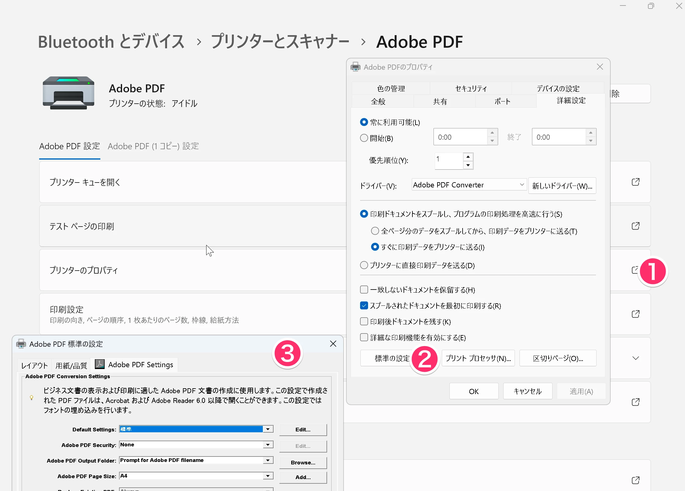 Adobe PDF 印刷設定を行っているのですが、一定周期で下記設定項目が戻ってしまいます。