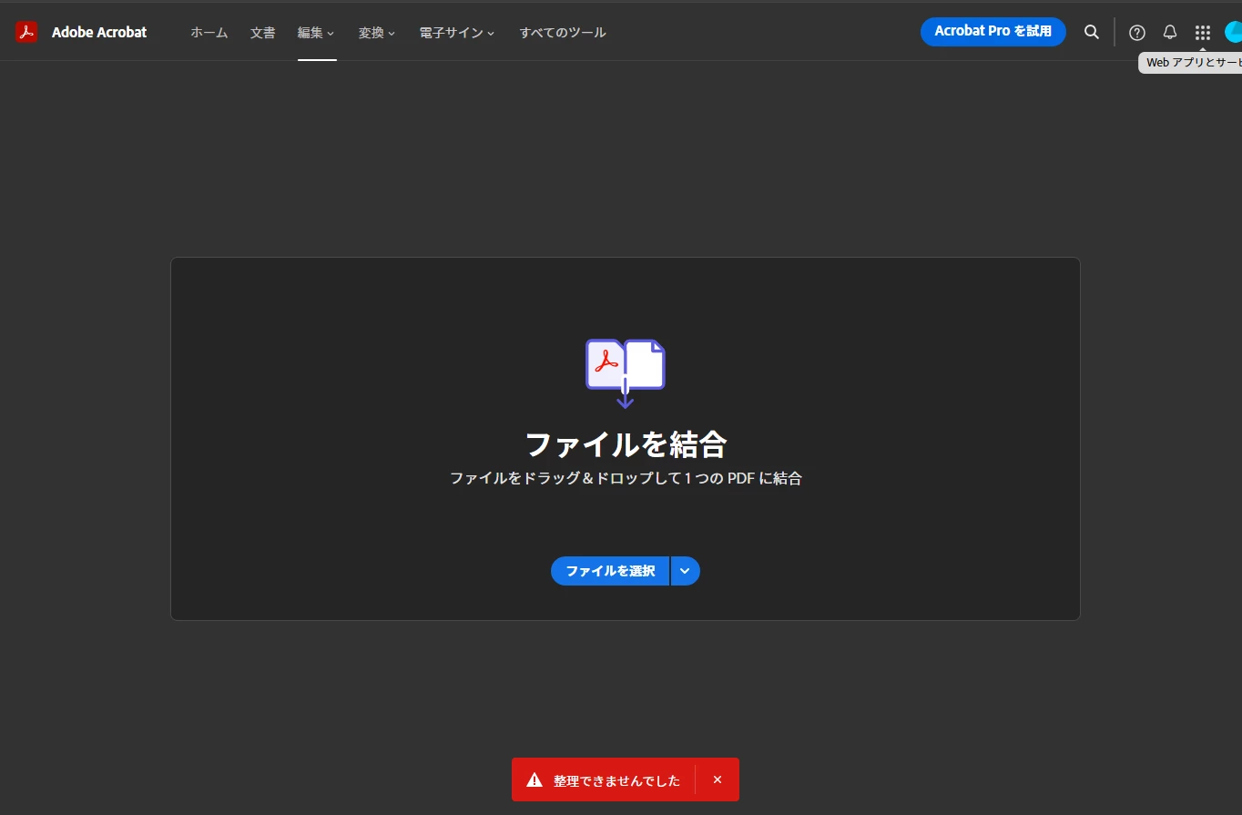 対象PDFはどれを選択しても、同様にエラーが表示されます。
