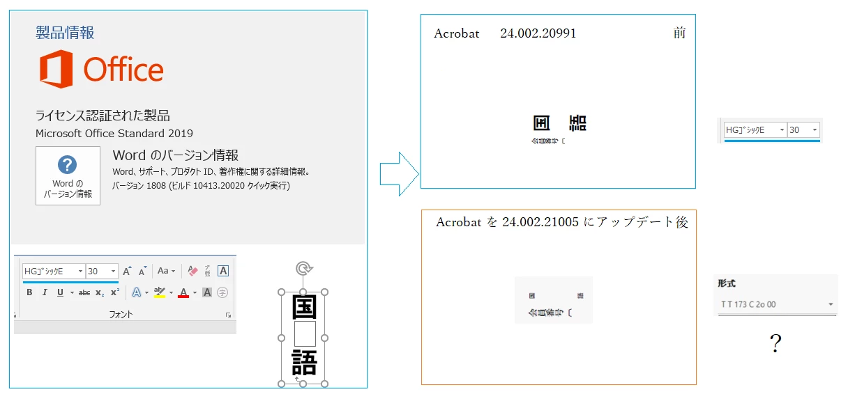 AdobeAcrobatProのバージョンを24.002.20991から24.002.21005へ更新すると、文字崩れが発生しました。