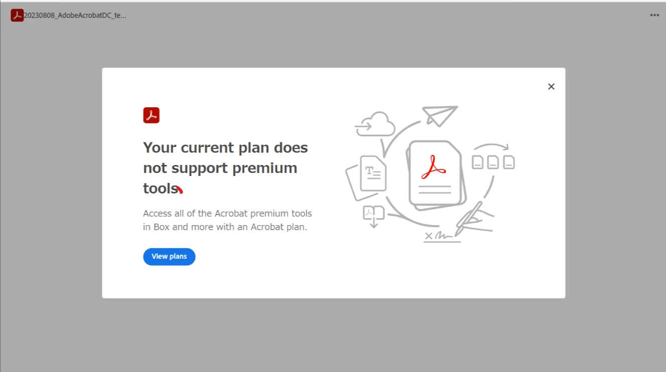 Boxから画像一枚目のCreate PDF with Adobe Acrobatを押下すると、画像2枚目のポップアップが表示され、Adobe Acrobatへ遷移されません。遷移が正常にできるようにするにはどうすればよろしいでしょうか、ご回答をいただけると幸いです。