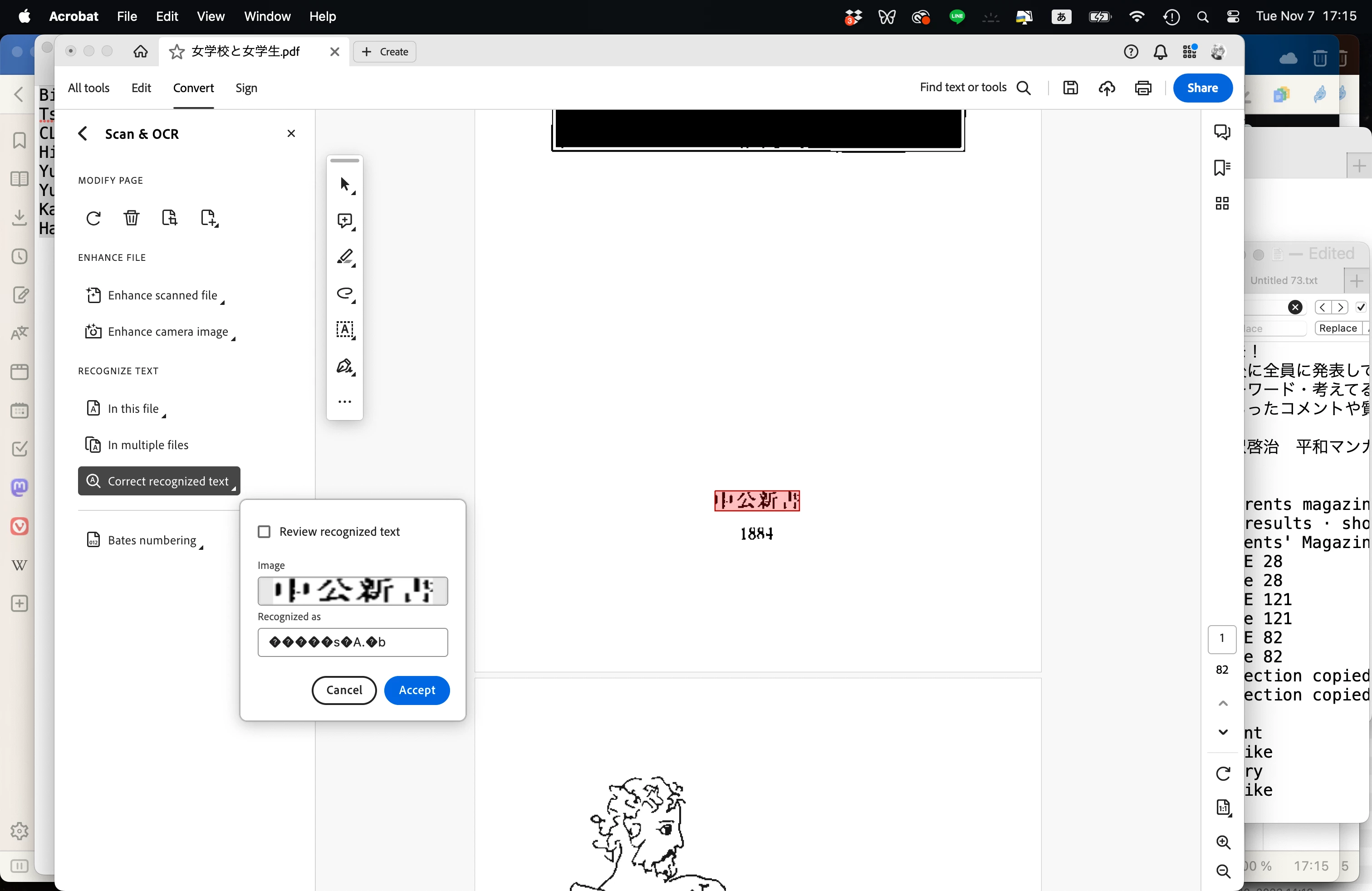 I want to correct the OCR recognized text of a scanned Japanese document, but even though Acrobat has successfully recognized 99% of the Japanese text, when I run "Correct recognized text," the text in the "Recognized as" space in the pop-up window displays as classic "mojibake" gibberish. Here's a concrete example. The actual Japanese text should be 中公新書. Acrobat successfully recoginizes the first three characters, but misinterprets the last character as ",'}." This is easily confirmed when I copy the recognized text into a word processor. Yet the pop-up window in "Correct recognized text" displays the recognized text as "�����s�A.�b" All the recognized Japanese text is displayed in this way, so Acrobat's "Correct recognized text" function is useless in Japanese. There's no way to tell from the displayed results whether the text was successfully recognized, and I can only check it by copying all the text and pasting it into a word processor, which makes correcting the text extremely difficult (obviously). Although the attached image is the app displaying in English, when I switch the app language to Japanese the same thing happens.