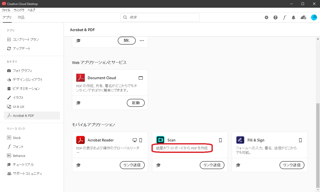 「アプリ」→「Acrobat&PDF」の下のほうにあるモバイルアプリケーションScanの説明文について。