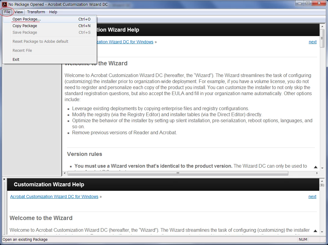 • File>Open Package>msiファイルを選択(msi ファイルはAcrobat DCのインストールフォルダ内に存在しております)