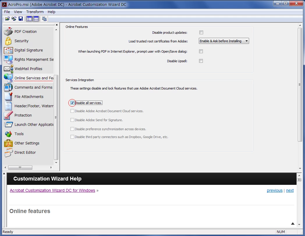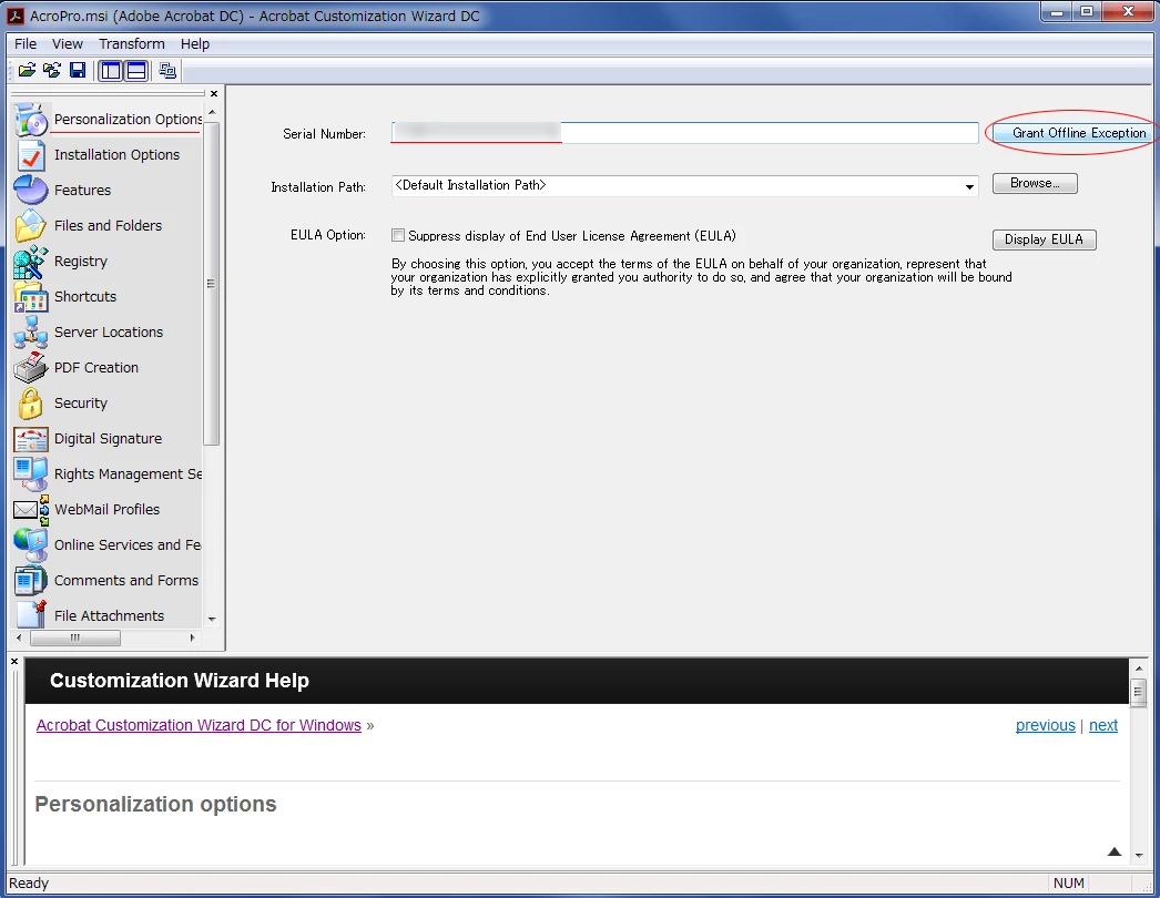 • Customization Wizardで作成したパッケージをインストール>Acrobat DC起動後の状態でOSイメージ作成ソフトウェアをご利用の場合、ライセンス認証が外れるケースが多々ございます。OSイメージ作成ソフトウェアをご利用の場合、マスタPCからのイメージコピーは行わず、Customization Wizardで作成したパッケージを個別に展開(インストール)してくださいますようお願いいたします