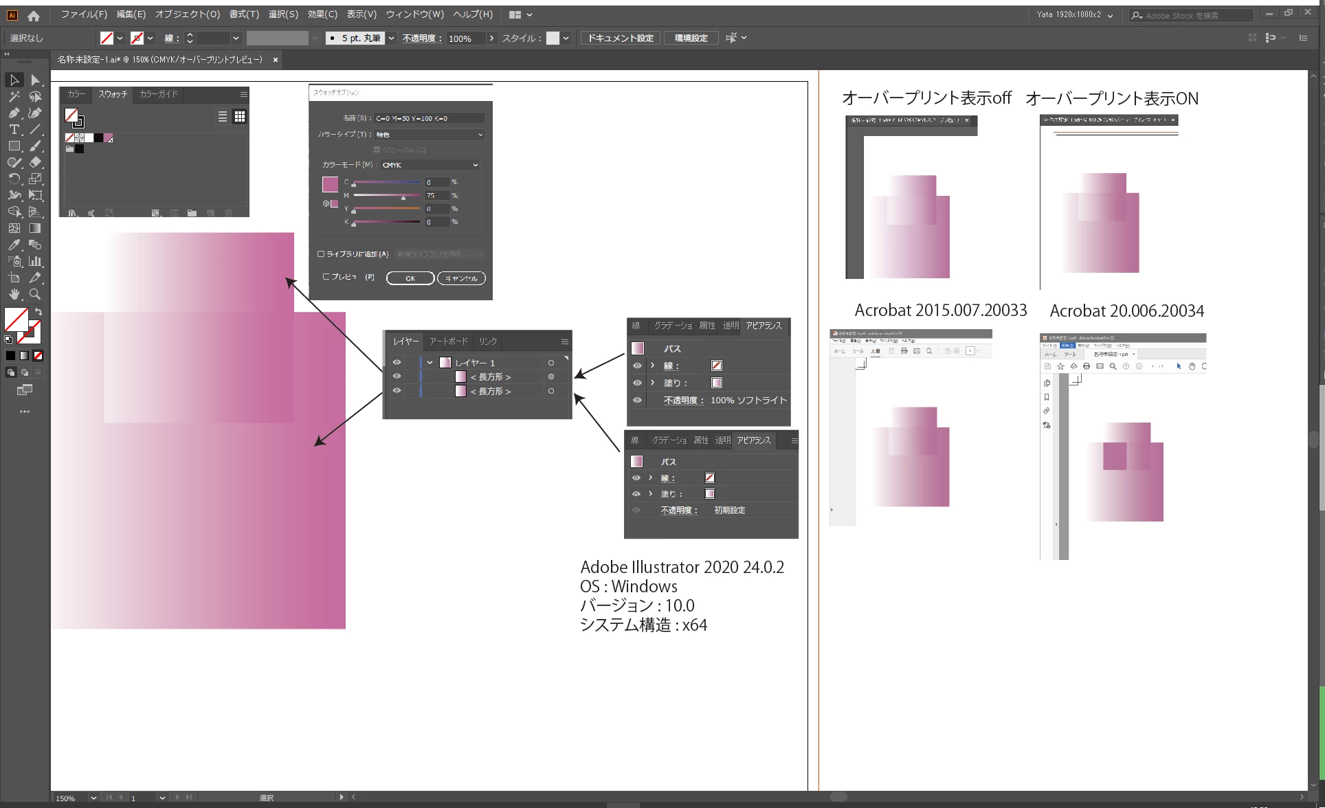 Illustrator側のオーバープリント表示のON/OFFなどの情報、Acrobatの出力プレビューによる結果、OSバージョンなどもあるのが望ましいです。