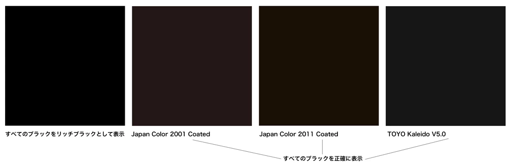 まず、Illustratorの環境設定で、ブラックのアピアランスが正しくカラーマネジメントされているか確認してください。「すべてのブラックをリッチブラックとして表示」になっているとアプリケーション上のでK100%は添付画像のような真っ黒で表示されてしまいます。「すべてのブラックを正確に表示」であればPDFと同じ色で表示される(全体としてのカラーマネジメントが正しければ)はずです。この場合のモニタで表示されるK100%の色はプロファイルに従います。