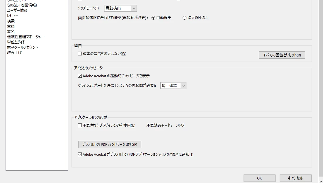 見当たりません。それと「pdfを毎回開く」の「デフォルトとして設定」を押しても反応ありません(押せません)。