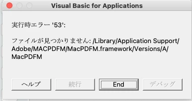 実行時エラー53 ファイルが見つかりません。/Library/Application support/adobe/MacPDFM.framework/Versions/A/MacPDFMと表示される。