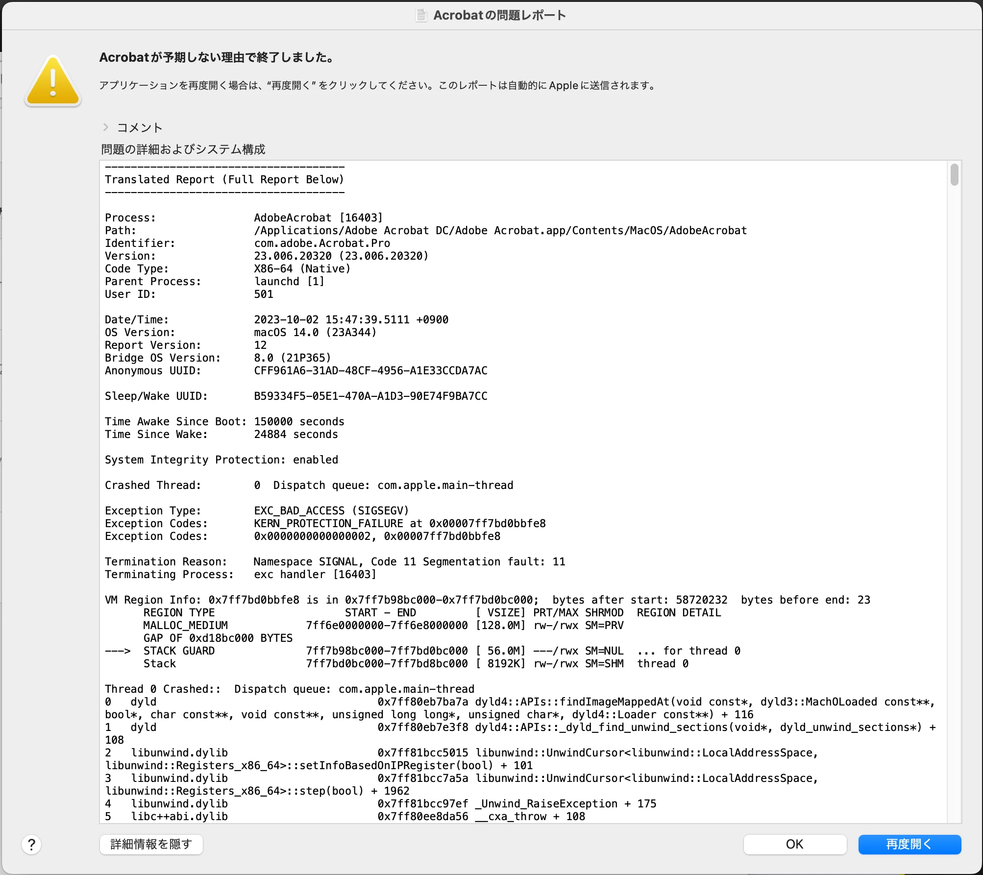 PPTZ_JPParticipantForum|Forum|2 years agoOctober 2, 2023質問macOS Sonomaにアップデート後PDFをAcrobatで開けないForum|Forum|2 years agoOctober 2, 2023返信数 2.1892 ビュー私有のM1 MacBookProでの動作確認後に、社有のiMacProをSonomaにアップデートしたところ、PDFをAcrobatで開こうとすると「Acrobatが予期しない理由で終了しました。」となり開けなくなりました。再度開いてもクラッシュを繰り返します。InDesign等でPDFの作成はできます。対策を促すために投稿しました。クラッシュまたはフリーズ